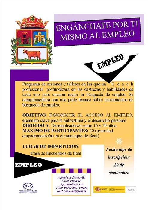 El proyecto “Engánchate por ti mismo al empleo” presentado por el Ayuntamiento de Boal al INJUVE ha resultado elegido junto con solamente otros 12 de entre todos los municipios españoles de entre 1000 y 5000 habitantes que se presentaron a la convocatoria de ayudas en materia de juventud de este año 2013.