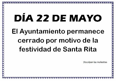 Mañana día 22 de mayo, con motivo de la festividad de Santa Rita (patrona de los funcionarios de la Administración Local), el Ayuntamiento permanecerá cerrado.