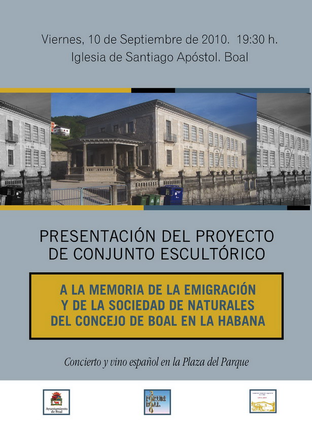 Próximos a celebrar este centenario de la fundación de la Sociedad de Naturales del concejo de Boal - y para el que ya se están organizando una serie de conferencias a lo largo del año 2011 con participación de los más destacados especialistas a nivel nacional- una familia boalesa, descendiente de emigrantes, ha tenido la iniciativa de ofrecer un homenaje a la memoria de los emigrantes en general y a esta Sociedad en particular. En colaboración con la Asociación Forum Boal 3000 y el Ayuntamiento de Boal se está intentando conseguir los fondos necesarios para que el escultor Amado González Hevia, “Favila”, cree el CONJUNTO ESCULTÓRICO DEDICADO A LA MEMORIA DE LOS EMIGRANTES Y DE LA SOCIEDAD DE NATURALES DEL CONCEJO DE BOAL, a ubicar en la Avenida de Asturias de Boal. A tal fin, se celebrará el próximo viernes día 10 de septiembre a las 19.30 horas en la iglesia parroquial de Boal (por motivos de aforo) el acto de presentación del proyecto, en el que intervendrán: representantes de la familia promotora, la asociación Forum Boal 3000, el escultor Favila y el Alcalde de Boal. El acto de presentación irá acompañado de un concierto en la propia iglesia y de un vino español.
